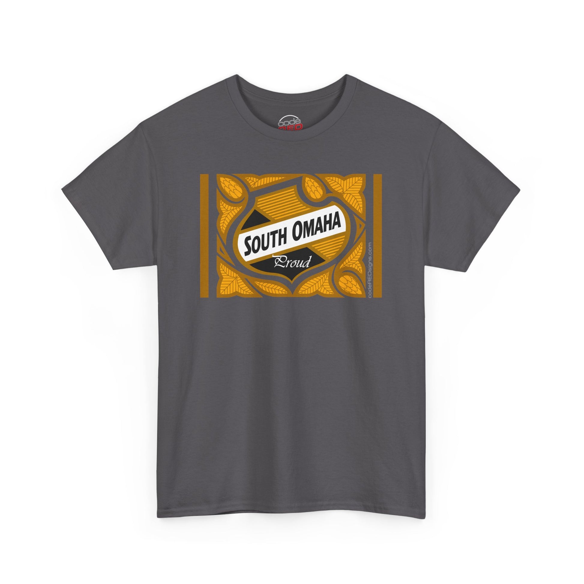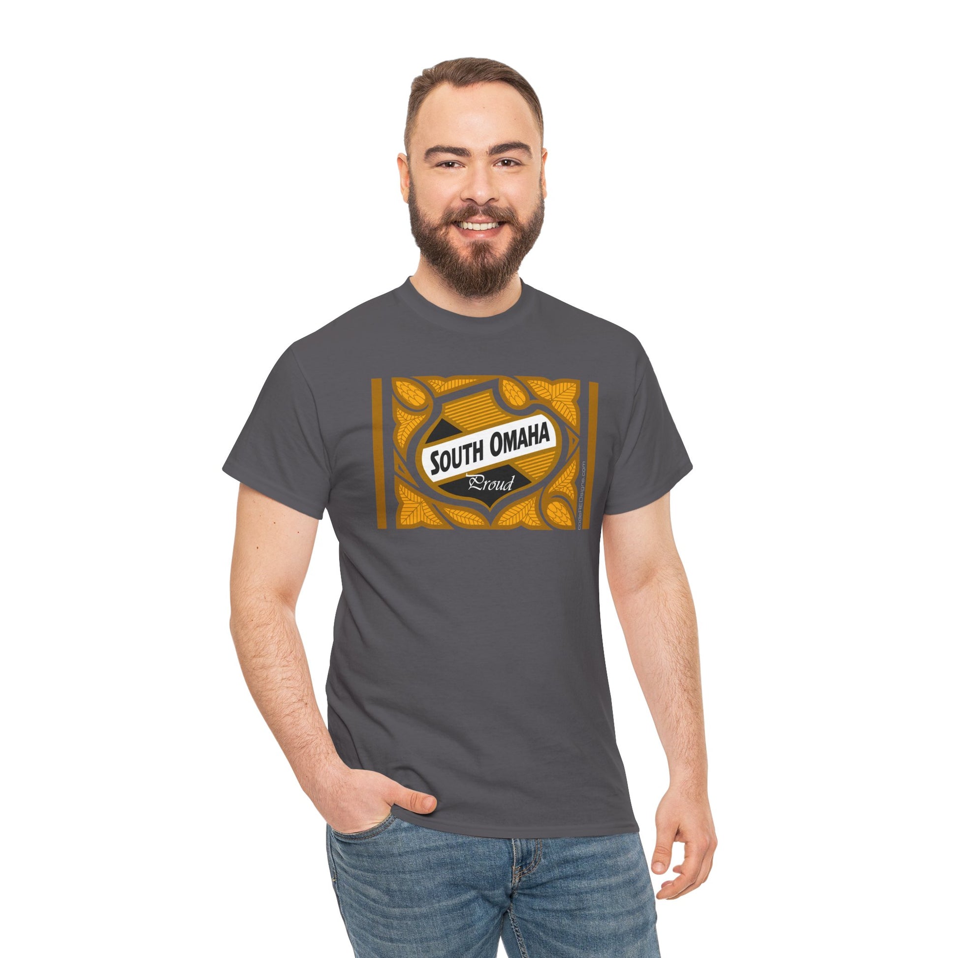 The iconic Black & Yellow Flastaff label with a South Omaha 'Proud' design on a Unisex heavy cotton tee. This tee exudes a casual and comfortable vibe, perfect for everyday wear or showing pride in your community. Ideal for adults looking for a stylish and unique shirt to wear during local celebrations or casual outings.